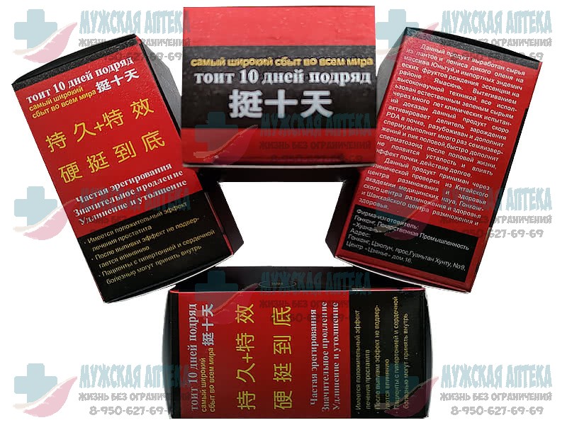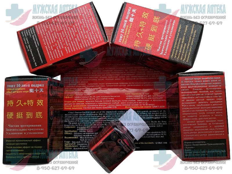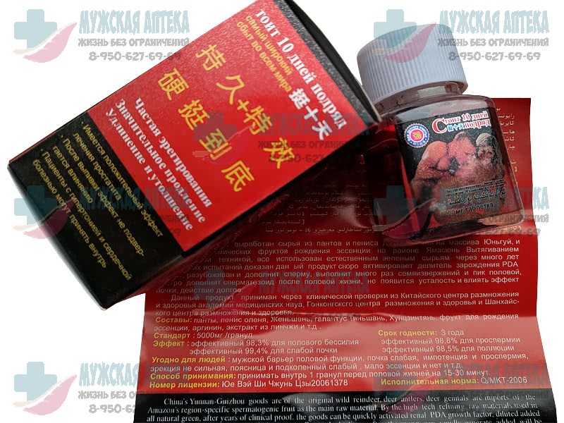 В состав продукта для потенции «Стоит 10 дней» входят только натуральные компоненты, такие как сырье из пантов и пениса дикого оленя из провинции Юньгуй и эндемических фруктов провинции Ямасунь. Лечебные свойства данных ингредиентов известны на протяжении многих лет в китайской медицине. Медицинская компания Гонконга «Хуань» разработала препарат для лечения основных проблем, связанных с мужской потенцией.